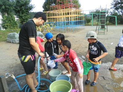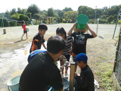 子供たちの中には、バケツにためた水を豪快にかけている子がいました。「びしょぬれパーティーだ。」と、嬉しそうに言っている子もいました。水しぶきが周りに飛び散り、子供たちは大はしゃぎでした。