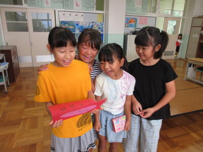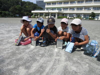 先日、校長室へ生活科の「夏の遊び」のことを伝えにきた1年生たちが、今日の5時間目に活動を行いました。様子を見に行くと、楽しそうな歓声が聞こえてきました。