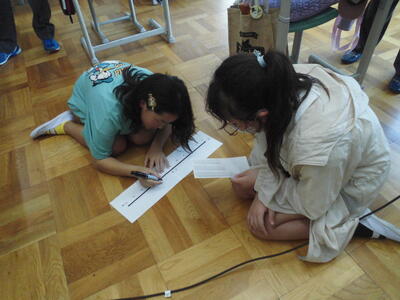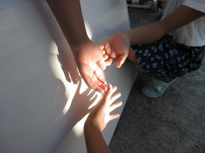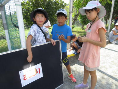 最後に光のリレーです。グループになって地面にはわせた光をリレーのようにつないでいきます。「難しいな」子どもたちは鏡の向きや角度を何度も調整し、チャレンジする姿が見られました。(DI)