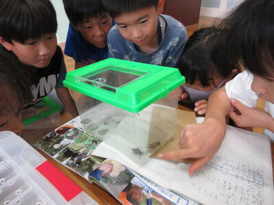 「オス、メスをどうやって見分ければいいのかな」「鳴くのはオスだけなのかな」「えさは何を食べるのかな」と、子供たちの疑問がどんどん広がりました。