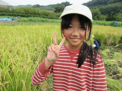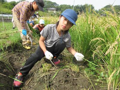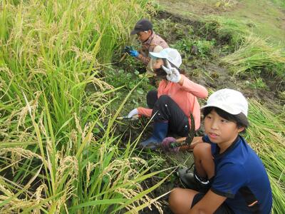 私が田んぼに合流したときには、すでに田の半分くらいまで稲刈りが進んでいました。初めて稲刈りをした4年生の子供たちは、少し不安な気持ちがあったようですが、協力者のKさんやFさんなどに丁寧に教えていただきながら作業を進めるうちに、こつをつかみ自信をもってできるようになったようでした。