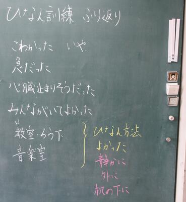 教室で振り返りを行った際、多くの子が、「びっくりした」「急だった」「こわかった」という内容を話しました。「高学年だから全ての人が大丈夫!というわけではない。」ことを、私は思い直したところです。職員は、事前に計画して今回の訓練を把握していますが、有事の際、自分はどのように行動するだろうと振り返りました。起こらないことが一番ではありますが、機会ごとに考えたり備えたりすることが大切であると思います。