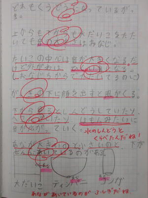 他にも「太鼓を叩くと、反対側の膜も震える」「太鼓の膜の外側をたたくと高い音、真ん中は低い音になるよ」など、実験を通してたくさんの気付きがありました。みなノートに驚くほど気付きを書きました。