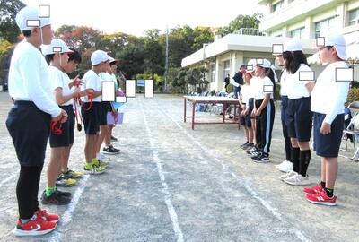 6年生の子供たちは、それぞれの学年の子が立つ位置をしっかりと把握していて、下級生の目印になりました。そして、1回目は「6年生のサポートあり」で、2回目は「6年生のサポートなし」でという形で練習を行い、滞りなく終えることができました。