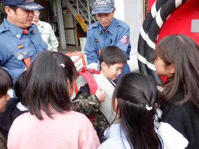 3年生の社会科の学習で、火災に関わる設備や仕事などについて学習しています。今日は、学校のすぐそばにある第5分団の詰所へ見学に行きました。団員の皆さんは、普段は消防以外の仕事をしていること、日々訓練をしていること、そして消防団のやりがいや思いについても伺いました。