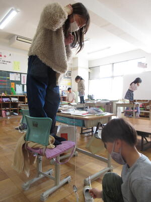 いすの上にいる子は、糸の先を耳に当てて、音が聞こえてくるか耳を澄ましています。「あっ、聞こえた」「糸が震えている」いすの上に立っていた子がにっこりしました。子どもたちは何度もスプーンを叩いて音が伝わる様子を試しました。