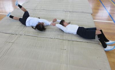 「時間走」や、「マットあそび」も、「やったー!」「なんか、楽しみ。」「おもしろそう!」と、いろいろな声が聞こえてきます。3分走り続けることは、なかなか大変だと思いますが、『自分のペースで走り続ける』『友達と比べず、自分と向き合う』ことを大切にしながら走っている様子が伝わってきます。マットあそびも、「手や足の力を付けるため。」「自分の体を支えるため。」と、自分の目標に向かっていろいろな方向に転がったり、体を反らせたりしています。