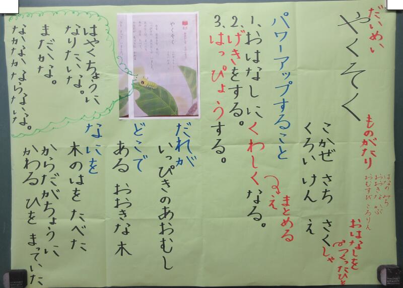 1匹の「あおむし」が自分と同じ姿の「あおむし」たちや「おおきな木」との関わりをとおして心を成長させるストーリーは、1年生がいろいろな仲間との出会いや関わりをとおして成長していく過程に重なります。子供たちは、「やっぱりね。」と、こちらが思うくらい、「劇・発表」をしたがっていました。これまでの物語文の学習と同様に、「おはなしに くわしくなろう」と、「げきを しよう」の2つのめあてで、学びが始まりました。