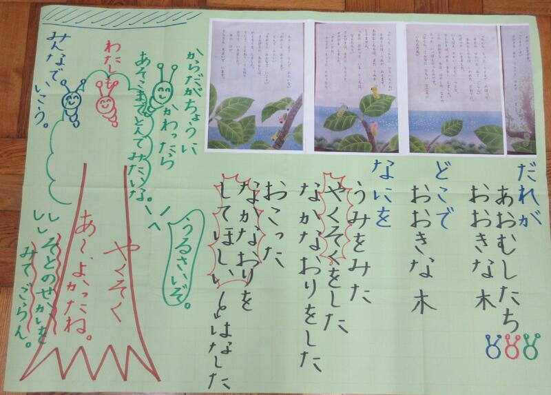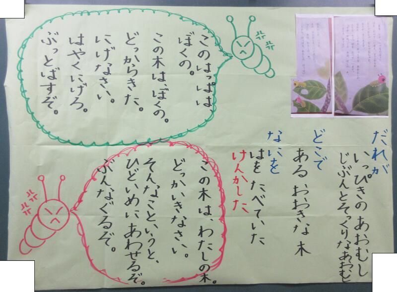 物語の終末、「あおむし」たちは、「おおきな 木」との関わりをとおして、自分の世界しか見えていなかったところから、大きく広い海の美しさに感動し、将来の「やくそく」をします。ここで、子供たちは、いくつも素晴らしい発言をします。「木は、おこっただけじゃない。あおむしたちに“なかなおり”をさせたかったんだよ。」「“なかなおり”して、“やくそく”して、よかったね。」「また、けんかしないでね。」子供たちは、「おおきな 木」にもなりきって、物語の世界を味わっています。私は、このお話の大きなテーマは「けんか(争い)」と「やくそく」と考えていますが、「おおきな 木」は、解決するきっかけ・生きる知恵をプレゼントしてくれているように感じています。その「おおきな 木」の立場を、1年生一人一人が感じて話したり書いたりする姿に、この学年の感情豊かなところ、大きな魅力を感じています。