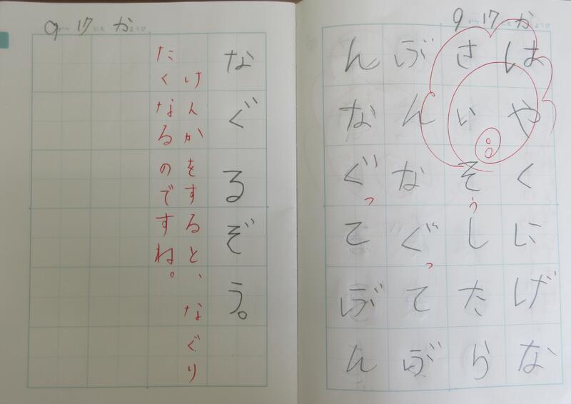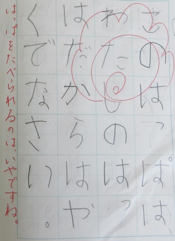 授業は、大きな流れとして、音読、読解、振り返りの3つで進んでいきました。何といっても素晴らしいところは、子供たちの「感情移入」です。これまでに、きっとどこかで、小さな・大きなけんかを繰り返しながら成長してきたのでしょう。本来の音読は、「だめ だめ。この 木は、ぼくの 木。ぼくの はっぱ。」ですが、子供たちの音読は、「だぁめぇ だぁめぇ~。この 木は、ぼぉ~くのぉ~『木』。ぼ!く!の! はっ『ぱ!』。」と、怒りのエネルギーが伝わってくるようです。また、読解では、叙述や挿絵だけでなく、自身の想像が広がり、「どっかにいきなさい。」「ひどいめにあわせるぞ。」と、まさに自分が「あおむし」になって、けんかを始めるかのようです。そのような思いが、振り返りにも表現されていました。ある子は、お家の方に、授業の様子や盛り上がり、オリジナルで考えたけんかの言葉について、「面白いノートがあるよ。」と、にやにやしながらノートを見せているとのことでした。
