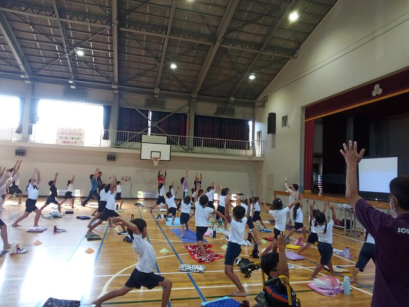 今日は、学校保健委員会がありました。全校児童と保護者の方、それに教員も、みんなでヨガをやりました。