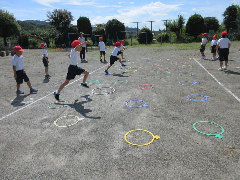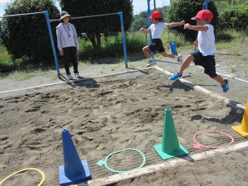 今後は、段ボール箱を跳び越えたり、ゴム跳びを行ったりすることにも取り組んでいきます。自分の体と向き合い、友達の素敵な動きを見付けながら、楽しい学びにしていきたいと思います。(FN)