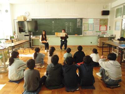 12月2日(月)の朝、お話キャンドルの方たちによる「冬のおはなし会」がありました。1時間目は低学年、2時間目は中学年、3時間目は高学年という順番で行われました。